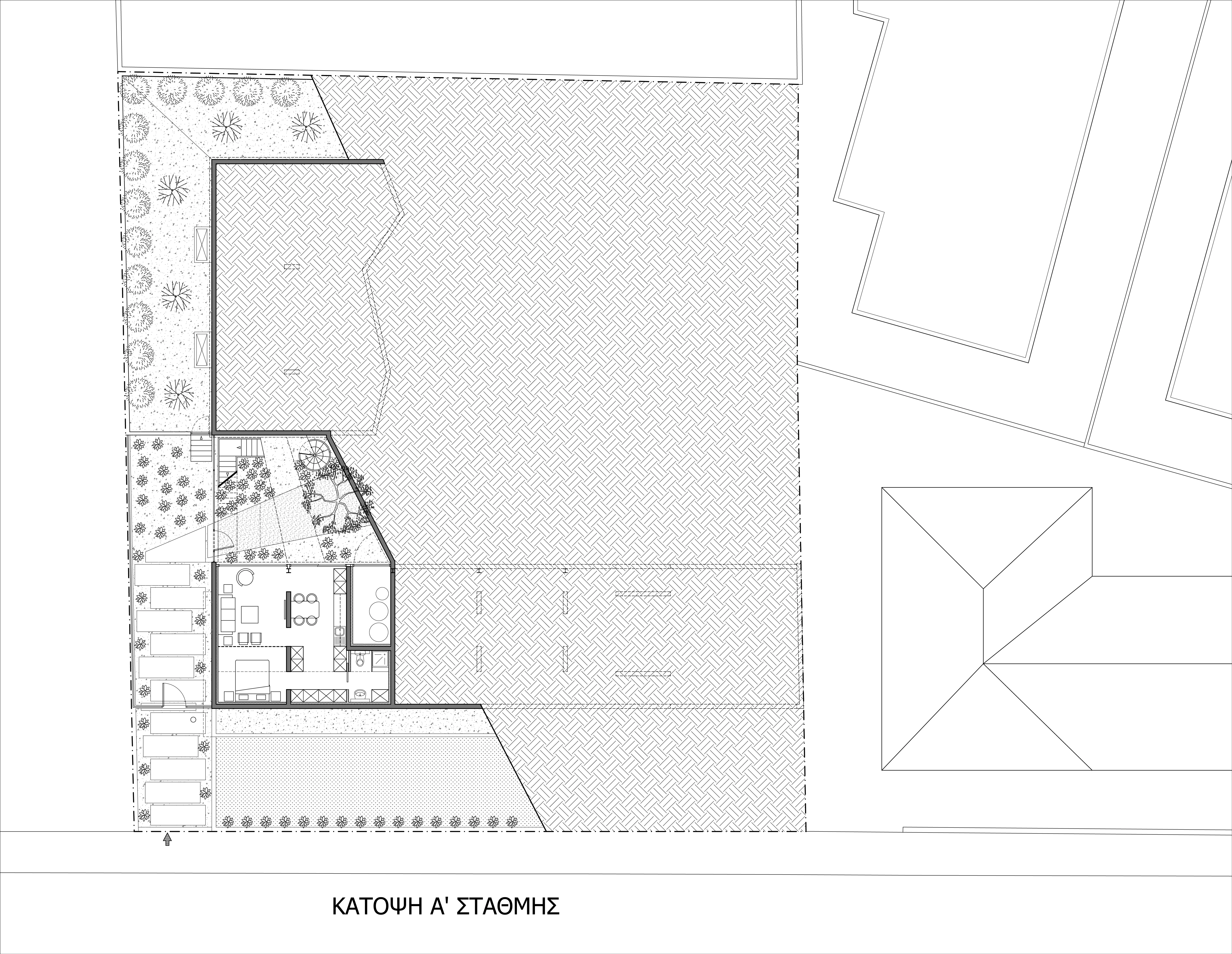-----The neighbouring southern green space mentally penetrates the plot creating the "back yard" of the house which represents the reference point of the whole composition. It then extends diagonally towards the north-east and by descending to a semi-roofed lower level, it opens up towards the eastern boundary of the plot, thus allowing the natural elements, light, air and rain to move freely through the project.